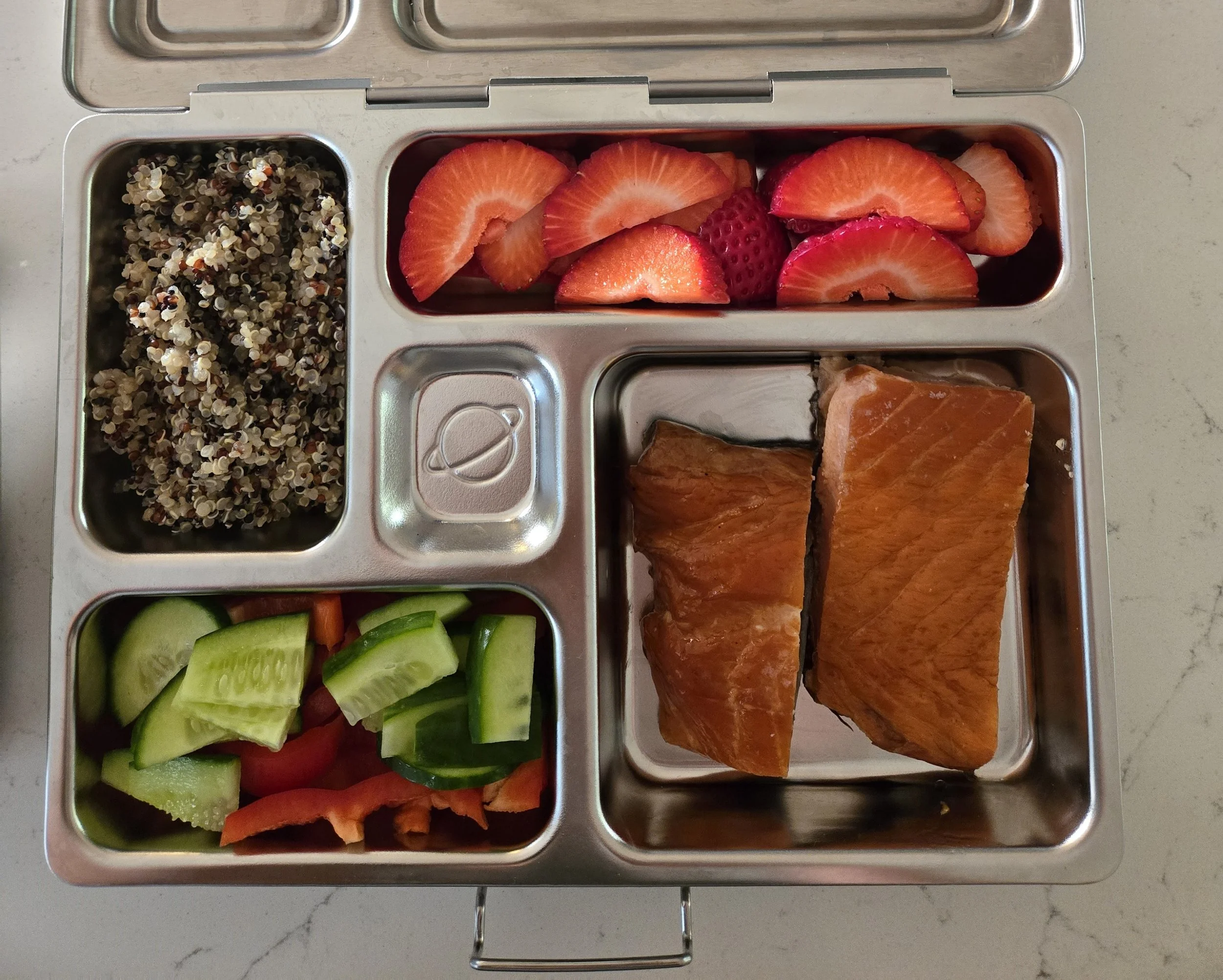 I try not to overcomplicate it and stick to three core categories: colorful fruits and veggies, protein & healthy fats, and complex carbohydrates. When I pack my sons’ lunches, I usually choose two items from the first category and one from each of the other categories. This simple formula helps me create well-rounded meals that keep them full, focused, and satisfied — and it makes lunch-packing less stressful for me. I usually pack lunches in the evenings instead of the morning, but you can choose whatever works best for you and your routine!